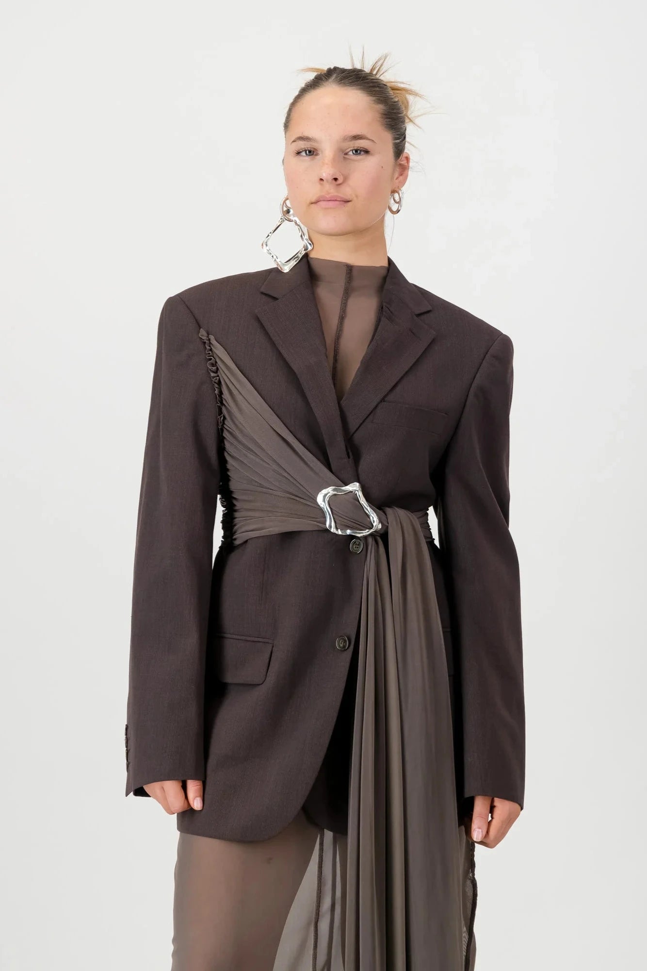 The Transform Blazer is an upcycled, one-of-a-kind piece that features two long mesh panels on the left side, which can be styled in a variety of ways for a personalized look. The lapels feature 2 gaps, which allow the mesh to be threaded through, creating multiple styling options that drape beautifully on the body.