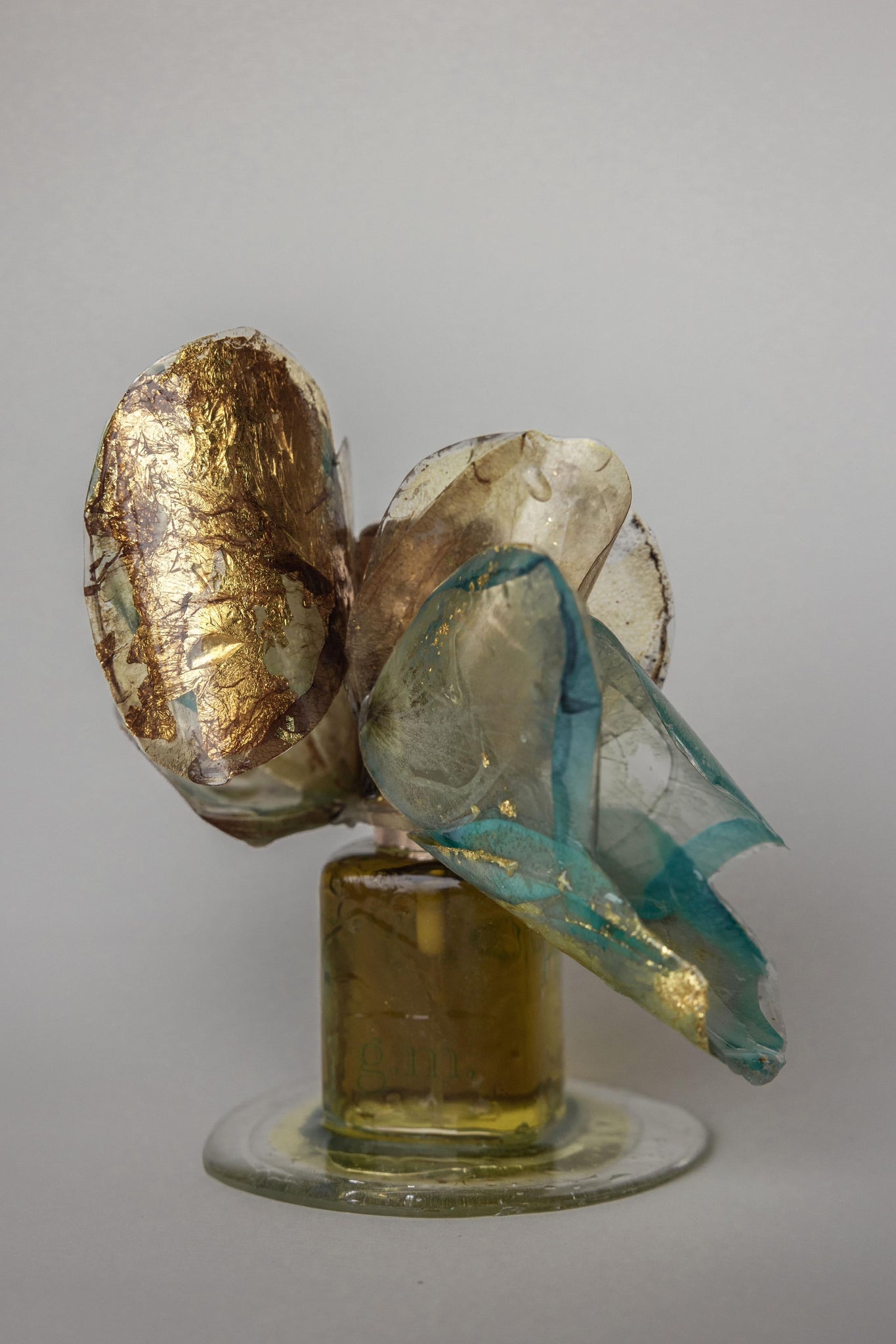 Each 30ml perfume vessel is presented as an artwork, sculptured with encapsulating resin and adorned with ethically-sourced natural specimens. Giant Moth wings, blue ink-stained crabs and molding rose petals are gold-gilded and frozen in time using plastic lamination and resin techniques. The perfume sculpture is an ode to the natural ecology of the Western Cape. The body of each perfume vessel is dripped in a bespoke-dyed resin, which has been tinted with natural elements from the perfume itself, such as hand-crafted cannabis absolute.