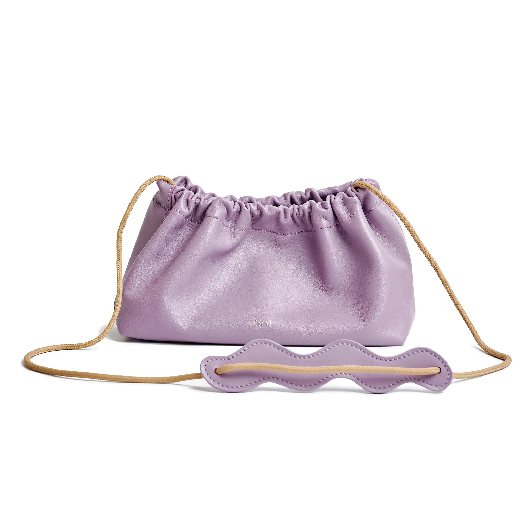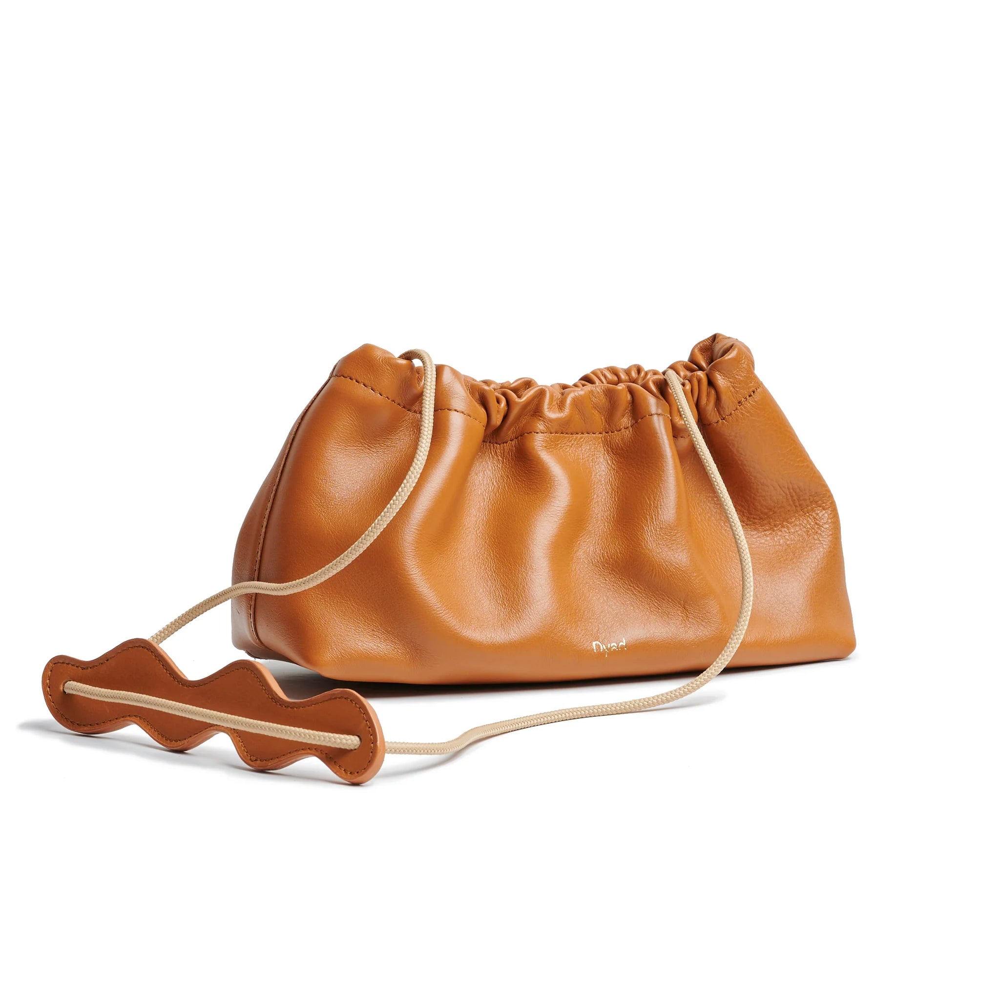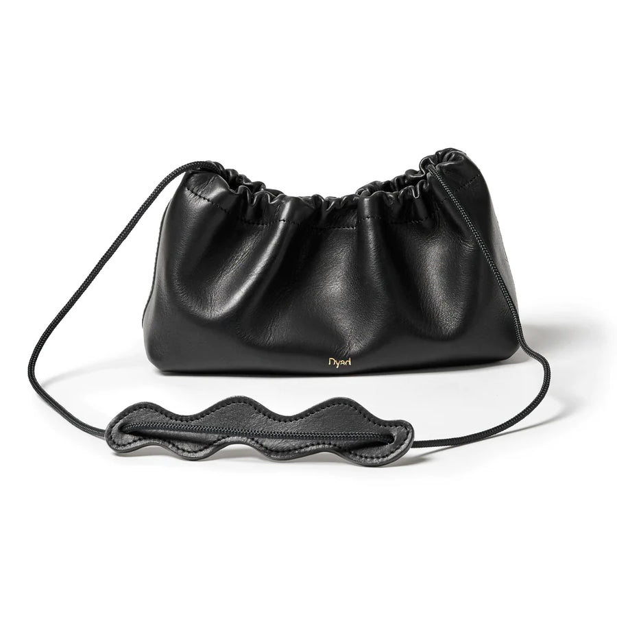 Small, yet spacious cow leather sling bag with ruche detail on the top and sailing rope strap.